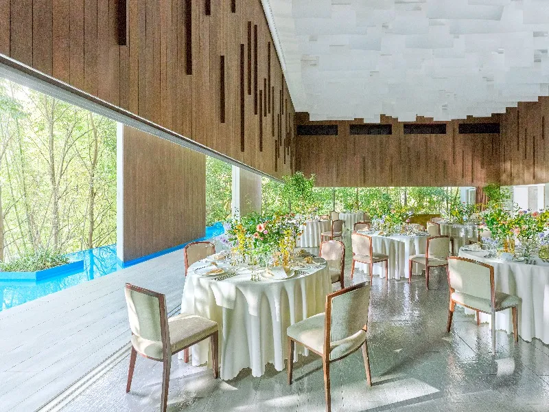 【爽やかなウォーターテラスに囲まれた会場を見学】◆窓をフルオープンにすれば、風も感じる開放的なパーティに◆テラス入場・階段入場などの演出を体験◆120名OK!ゆとりある広さもチェック