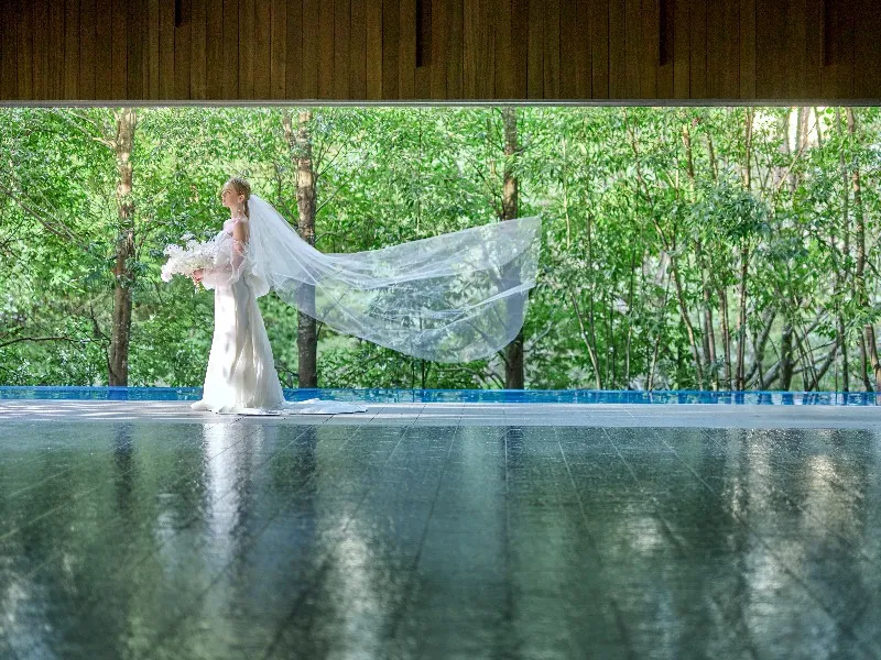 【唯一無二の『デザイナーズチャペル』で入場体験】◆幾重にも重なる白いヴェールと光が幻想的◆「初めて見るデザイン!」とゲストにも好評◆フェアでは、オリジナル演出の体験も◆大階段でのフラワーシャワーも叶う